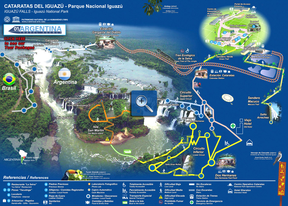 More than 80% of their limits are international, bordering the north and east by the Republic of Brazil, and west by the Republic of Paraguay. Iguazu National Park map. The surface of the province is 29,801 square kilometers, equivalent size to almost 1% of the total land area. Over a thousand kilometers of international borders surrounding the province. Its geographical position makes it a very unique province. Iguazú Rivers, San Antonio, Pepirí Guazú and Uruguay are the limits with Brazil to the north, east and south west Paraná River marks the border with the Republic of Paraguay. To the southwest, and the streams Chimiray and Itaembé establish the border with the province of Corrientes, Argentina. But it also has a few feet of dry border: the town of Bernardo de Irigoyen Argentina connects with neighboring Brazilian Dionisio Cerqueira, barely a city street. Iguazu National Park is an amazing place to visit in your next trip to Argentina. Look more Iguazu Falls tours in our website and contact us for a quotation. So in this page we provide you update and useful information to get oriented inside the National Parks with these maps of the Iguazu falls National Parks. We also can provide you by request the Maps of the town of Puerto Iguazu (Argentina) and Foz do Iguazu (Brazil). Feel free to contact us as well to request us a quotation for a complete tour packages to visit this incredible natural destination departing from Buenos Aires or from Rio. We have a large list of accommodations, tours and domestic airfares to make you easier the organization of your travel. Map of Iguazu National Park for free |